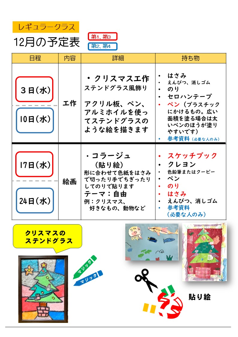 色鉛筆またはクーピー、のり、ボンド、セロハンテープ、粘土ベラ