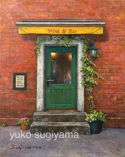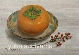 「路地裏のワインバー」油彩、F3 「柿と南天」油彩、SM あなたのためのカレンダー展Ⅹ